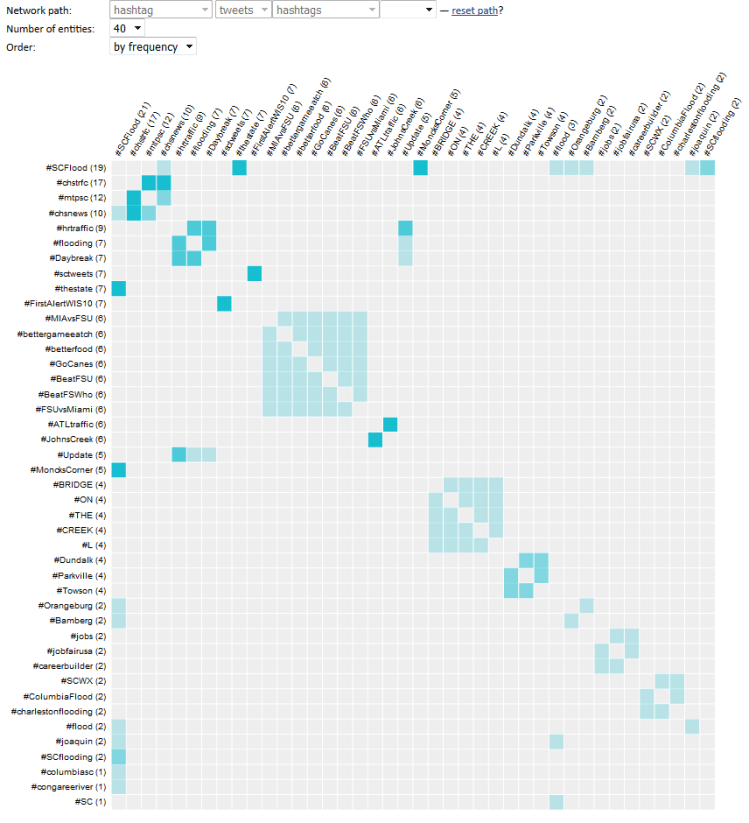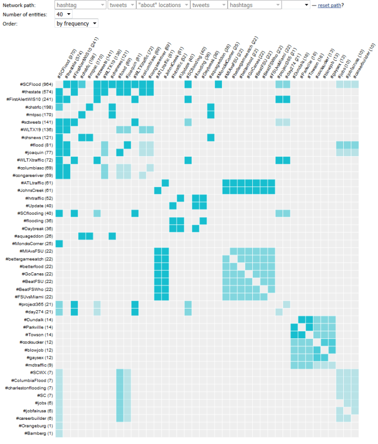 When applied to a realistic dataset, the reorderable matrix + HINM combination becomes a potent pattern detection tool. For example, the figure below shows an attempt to identify and group hashtags that can be used to monitor an unfolding emergency (a series of major floods in South Carolina, as captured in Twitter data). The matrix on the left shows the initial attempt at analysis, where hashtags are shown as related when they are mentioned in the same tweet (notice the meta-path at the top). The matrix on the right shows hashtags as related when they refer to the same place (again, see the meta-path on top). The second attempt is clearly superior — notice the surge in the volume of connections identified between the hashtags.
