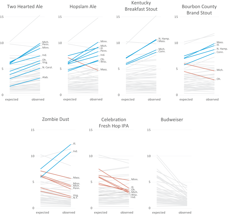 Regional patterns also come through quite clearly in the resulting dataset. The figure below shows a collection of slope charts, one chart for each beer label, that illustrate their popularity across the US. In each of the charts, a single line corresponds to a single state, and ascending and descending lines correspond to states with disproportionately high and low interest in the beer label in question. If you have a knack for detail, the numbers on the vertical scale correspond to the number of reviews per 100,000 people, and color is used to highlight states with most pronounced and robust preferences for a particular beer label. As before, this chart was in agreement with my colleagues’ expert opinion on expected patterns of beer consumption — see, for example, Zombie Dust chart, where you can see a strong consumer base in Illinois and Indiana, and a depressed amount of interest pretty much everywhere else, indicating a very regional label.