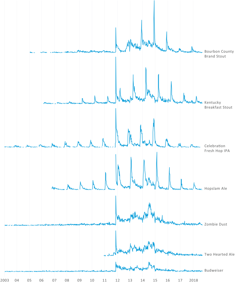 The figure below shows the temporal patterns of consumer interest for those seven labels. Although there are quite a few trends visible, one of the core findings that persuaded my colleagues in the validity of this approach is the presence of clear seasonality patterns for seasonal beer labels — notice the repeated seasonal spikes that coincide with yearly product releases. Non-seasonal beer labels (towards the bottom of the chart) lack such regular spikes and provide a baseline for comparison.